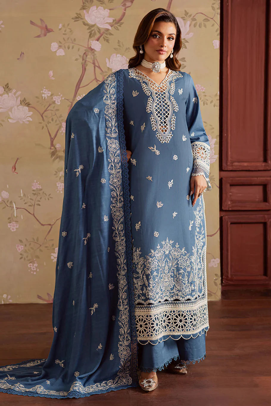 MAHNUR - 3PC DHANAK EMBROIDERED SHIRT WITH DHANAK EMBROIDERED SHAWL AND TROUSER - HZU2491